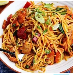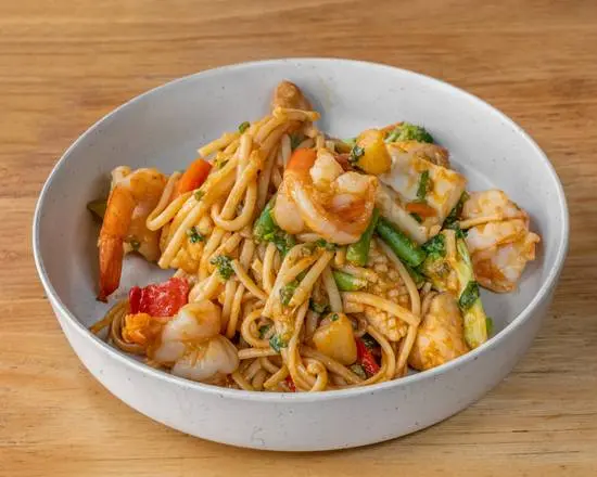 Stir fried noodles with king prawns, sauteed with scallops, calamari, fish fillet and vegetables in a tomato based sauce and garnished with coriander.