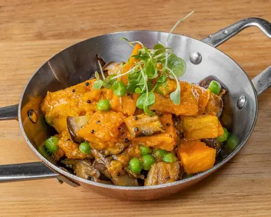 Roasted eggplant and pumpkin cooked with green peas in a tomato based gravy.