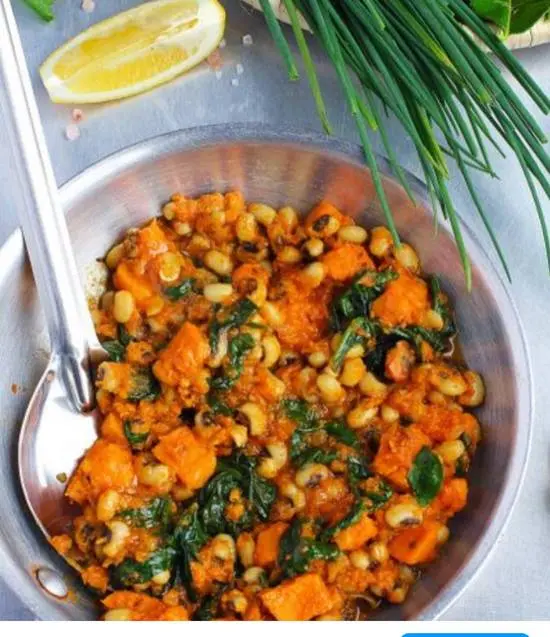 Sweet potatoes, black eye beans and spinach cooked with tomato, onion, garlic, ginger and cumin powder.